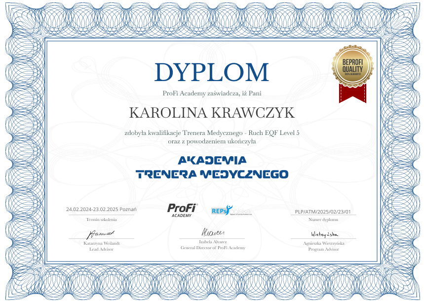 Po ukończeniu kursu otrzymasz aż 5 certyfikatów, które potwierdzą Twoje kwalifikacje jako profesjonalnego Trenera Personalnego i zwiększą Twoją wartość na rynku pracy. Dzięki nim zyskasz solidne fundamenty do prowadzenia treningów oraz dodatkowe kompetencje w zakresie dietetyki i anatomii.